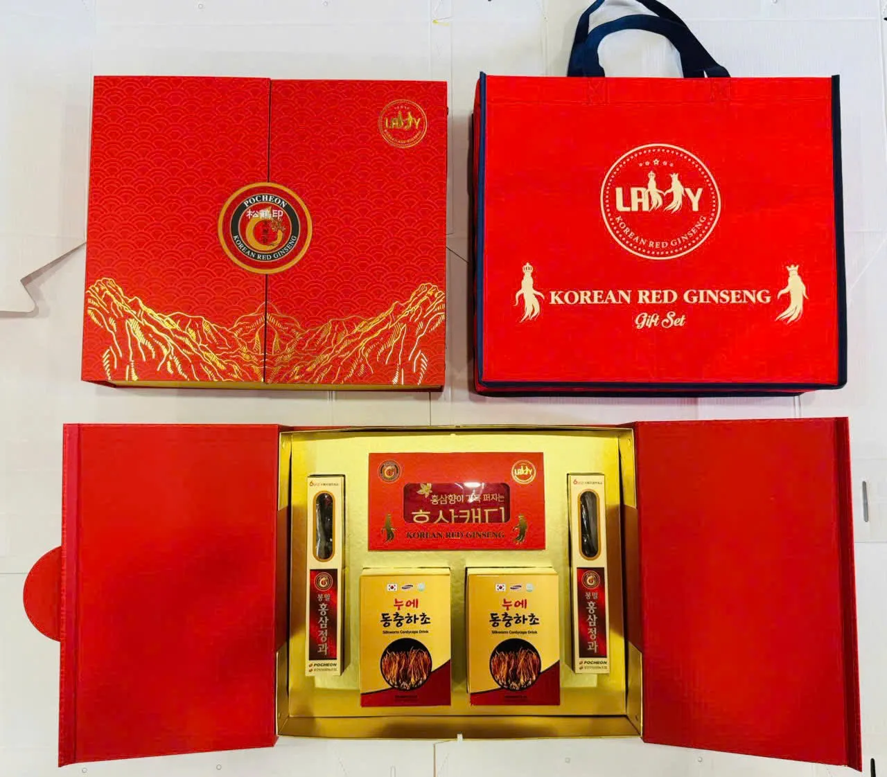 - 02 hộp nước Đông trùng hạ thảo Hàn Quốc (30ml x 10 gói/hộp): tăng cường sinh lực, cải thiện giấc ngủ, giảm mệt mỏi và giúp phục hồi cơ thể.
